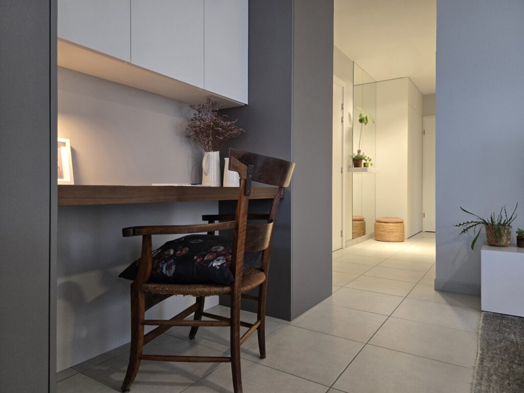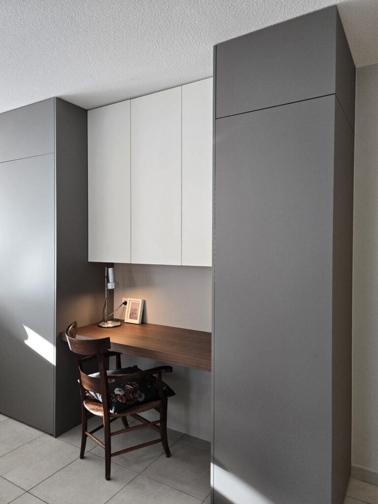 La zone de travail s’inscrit dans un ensemble de colonnes toute hauteur, créant l’illusion d’un volume unique et épuré. Ce bureau intégré disparaît presque lorsqu’il n’est pas utilisé, pour laisser toute la place à la vie de la pièce. Cette conception permet d’allier fonctionnalité et esthétisme, sans compromettre la lecture de l’ensemble.