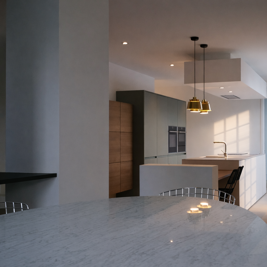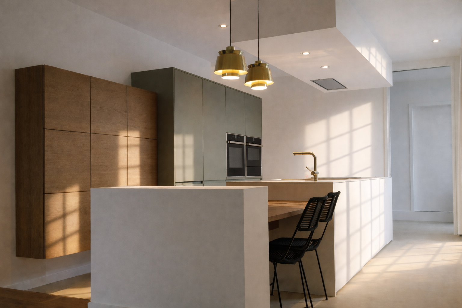 Derrière les colonnes se niche un second espace, réservé à l’organisation du petit ménager : un poste fonctionnel, dissimulé mais toujours facilement accessible.