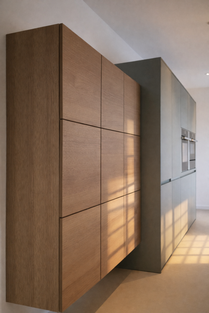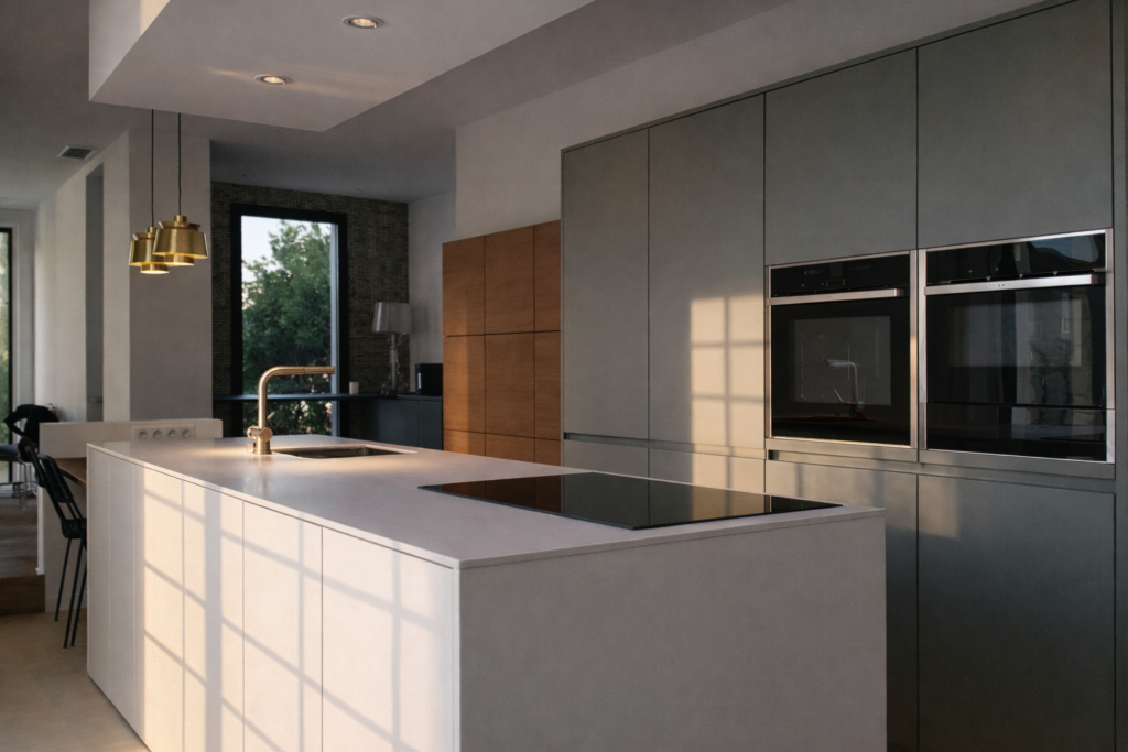 Vision d’un aménagement cuisine imaginé dans un passage étroit, entre le hall d’entrée et la pièce de vie.